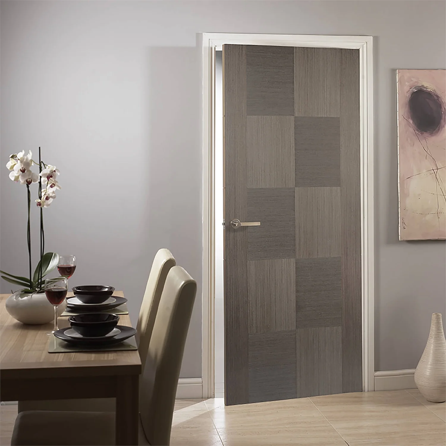 A contemporary grey internal door, Apollo is the perfect door choice if you’re looking to add a modern touch to a property. The distinctive chocolate grey finish is complemented by a striking chequerboard pattern, making this interior door a key contemporary look. It’s versatile too, ideal for any room in a home, from bedroom and living room to kitchen and dining room. Choose this door when you’re looking for something a little different.