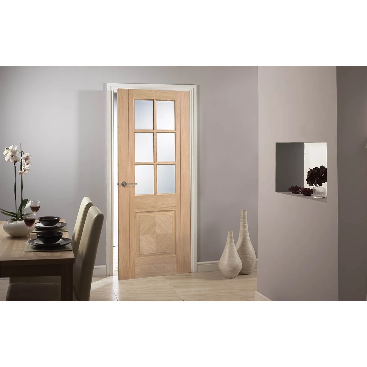 The glazed Barcelona features six panels of clear bevelled glazing above a shaped panel with checkerboard pattern. An elegant look with a timeless feel, you can hang this door in a property of almost any style and enjoy it’s exceptional finish. With glazing that lets the light into a room, it’s a natural choice for a dining room. Wherever you choose to fit it, you’ll find it enhances the tone of your interior. In smooth prefinished oak.