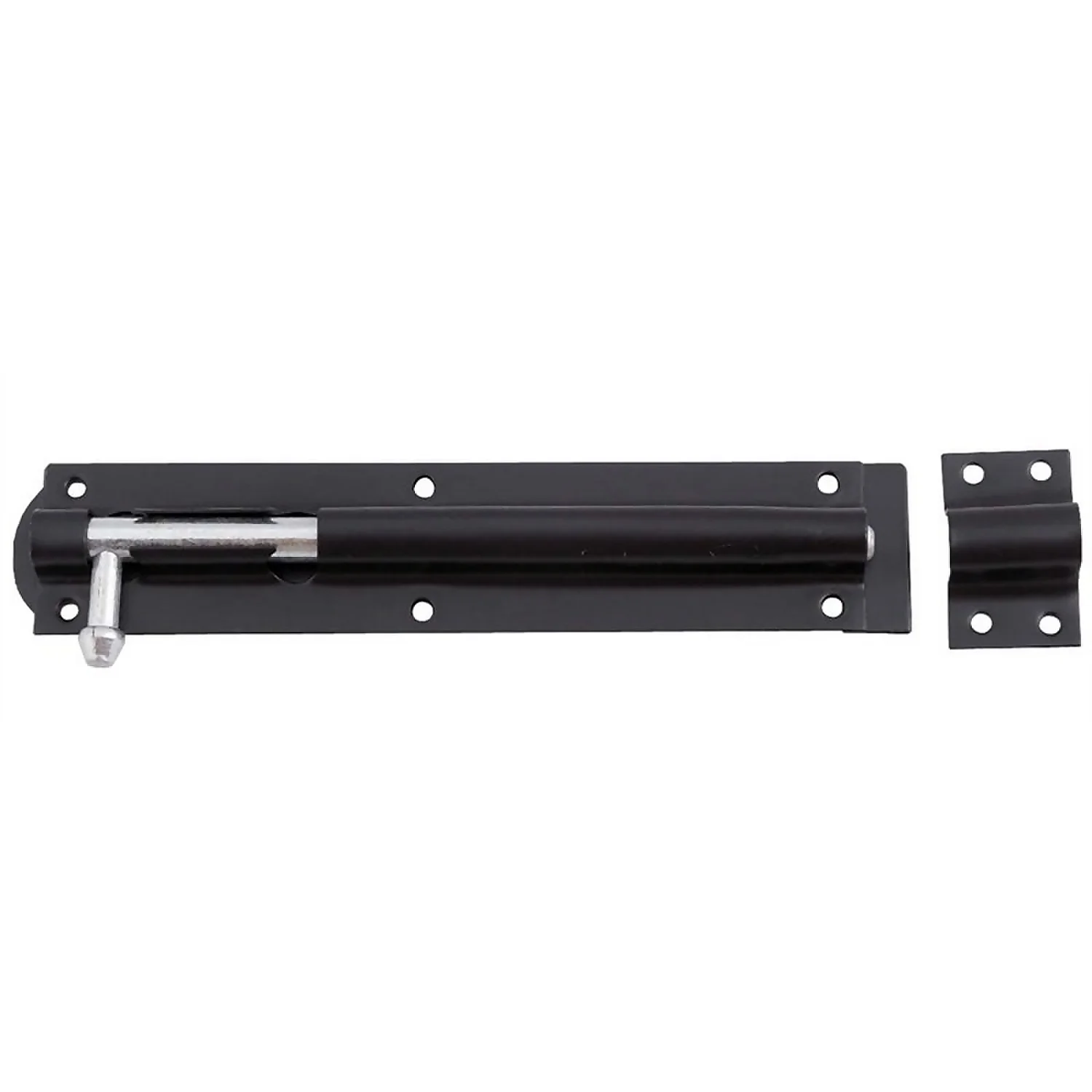 Strong steel tower bolt for securing gates, sheds and large doors.