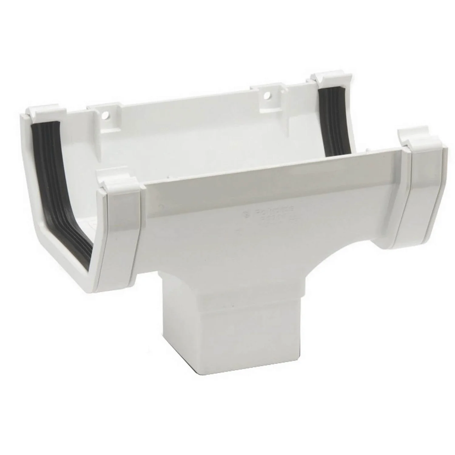 A white square gutter running outlet, suitable for use with 112mm piping.