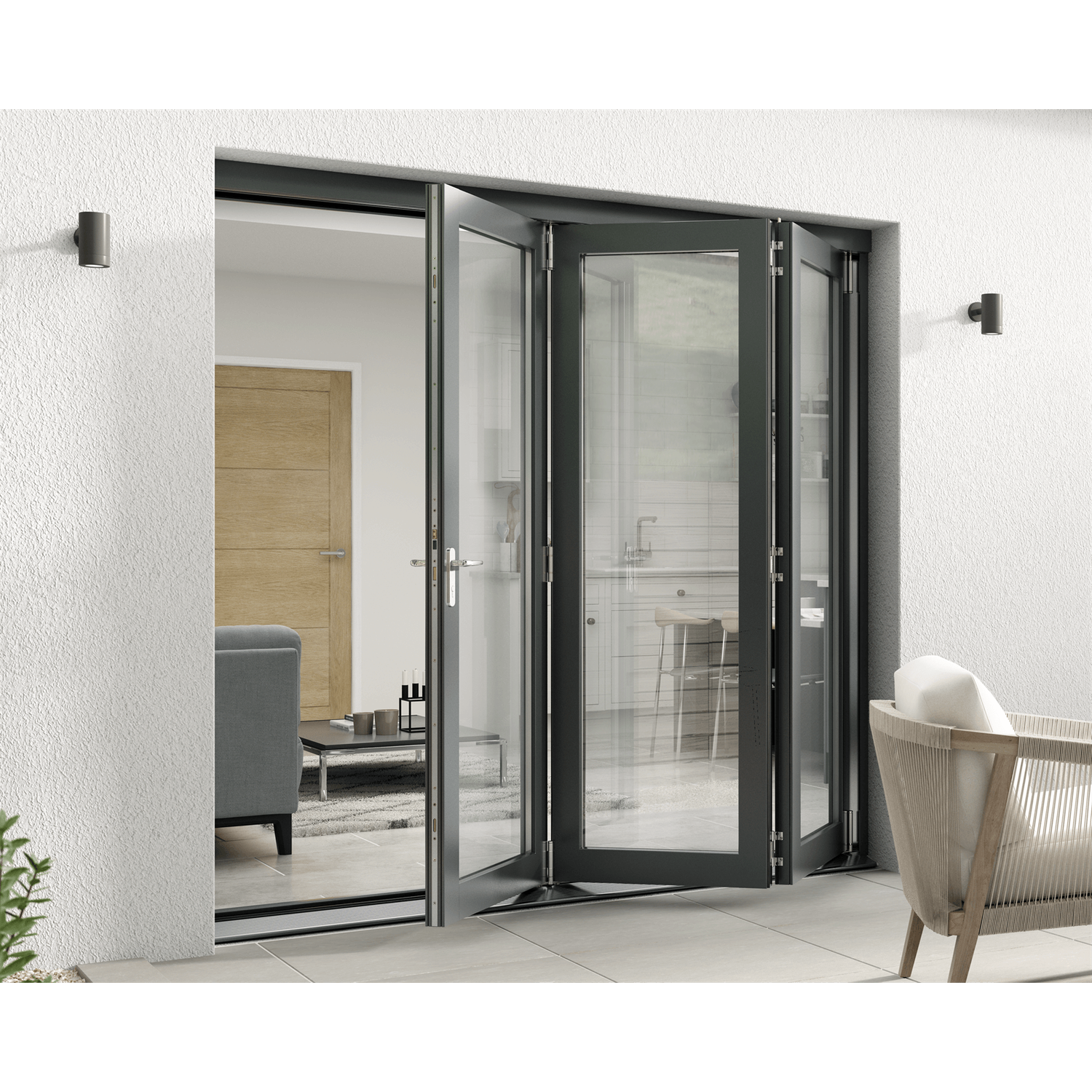 These external Bifold Doors, factory finished in Anthracite Grey (RAL7016M), feature a preservative-treated Engineered timber core, which is also treated with a water-repellent system for long-term stability and durability. The doors come factory-glazed with high performance LowE DG Units achieving a whole product U Value (thermal insulation) of 1.5 W/m2K.